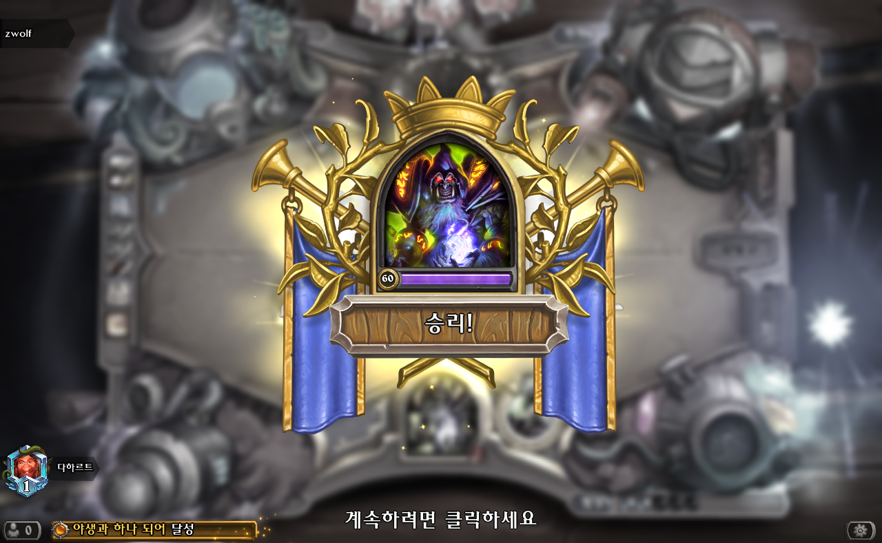 9월에는 너프전 암흑시선 자해흑마법사로 달성했다면 이번에는 너프후 자해흑마법사. 여전히 거인덱은 강력한데 새 확장팩 나오기 전에 달성해서 다행이려나..